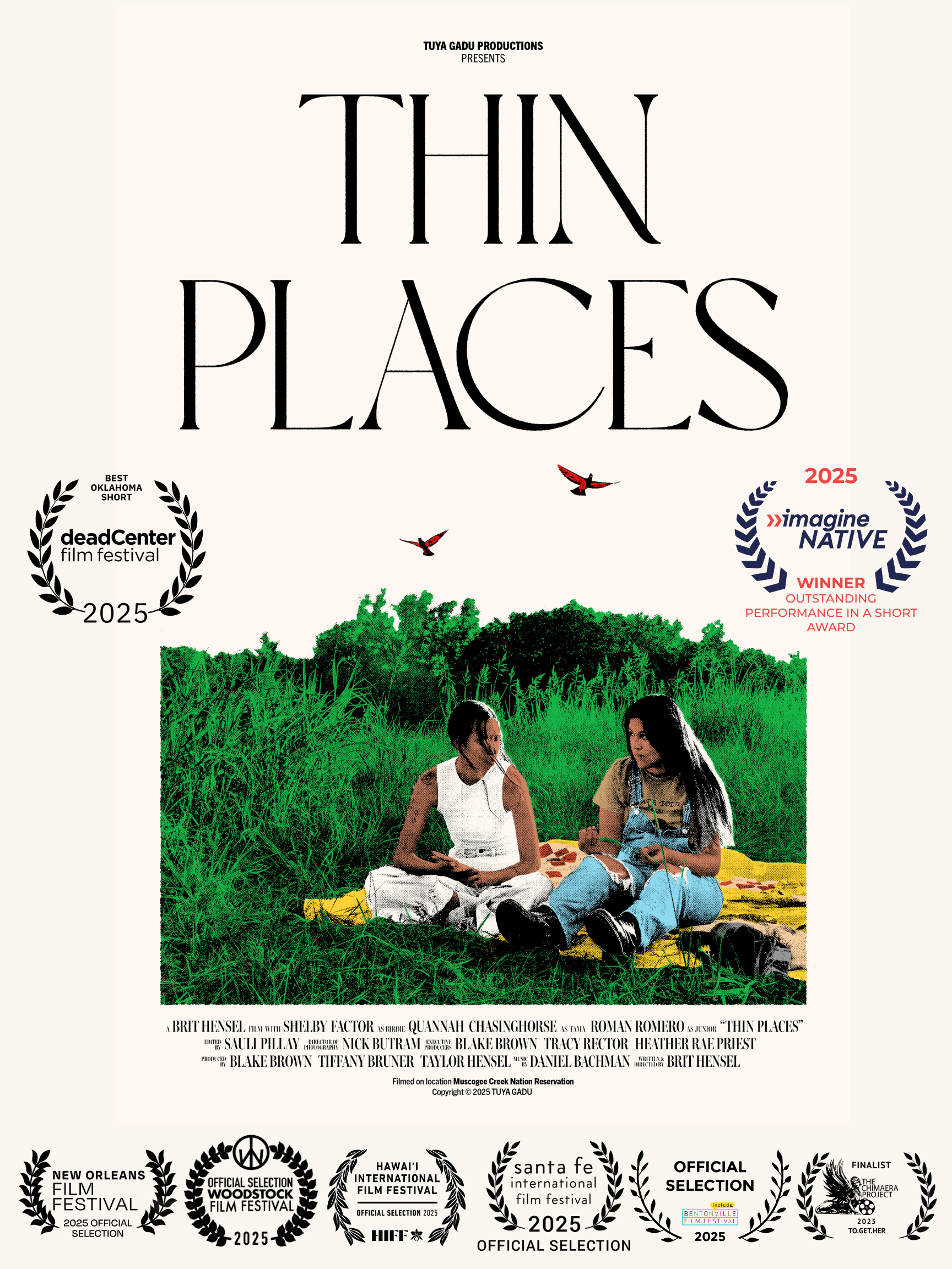 Thin Places was shot entirely on the Muscogee Creek Nation Reservation in Tulsa, Oklahoma. Starring, written, directed, and produced by Native women from the Caddo, Cherokee Nation, Chickasaw, Han Gwich’in, Muscogee Creek, Seminole, and Sicangu/Oglala Lakota Nations.